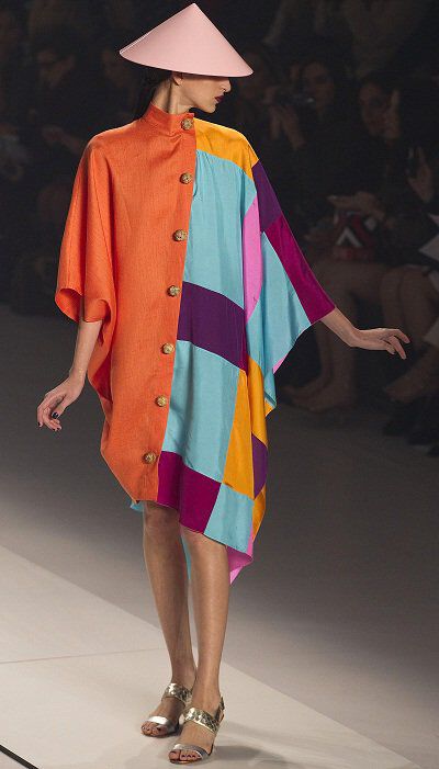 Trang phục mang hơi hướng nghệ thuật với chiếc nón hình chóp mang đến sự hài hòa trong tổng thể trang phục cho thiết kế trang phục đến từ thương hiệu thời trang Neon từng xuất hiện tại Tuần lễ thời trang Sao Paulo 2013 (Brazil).